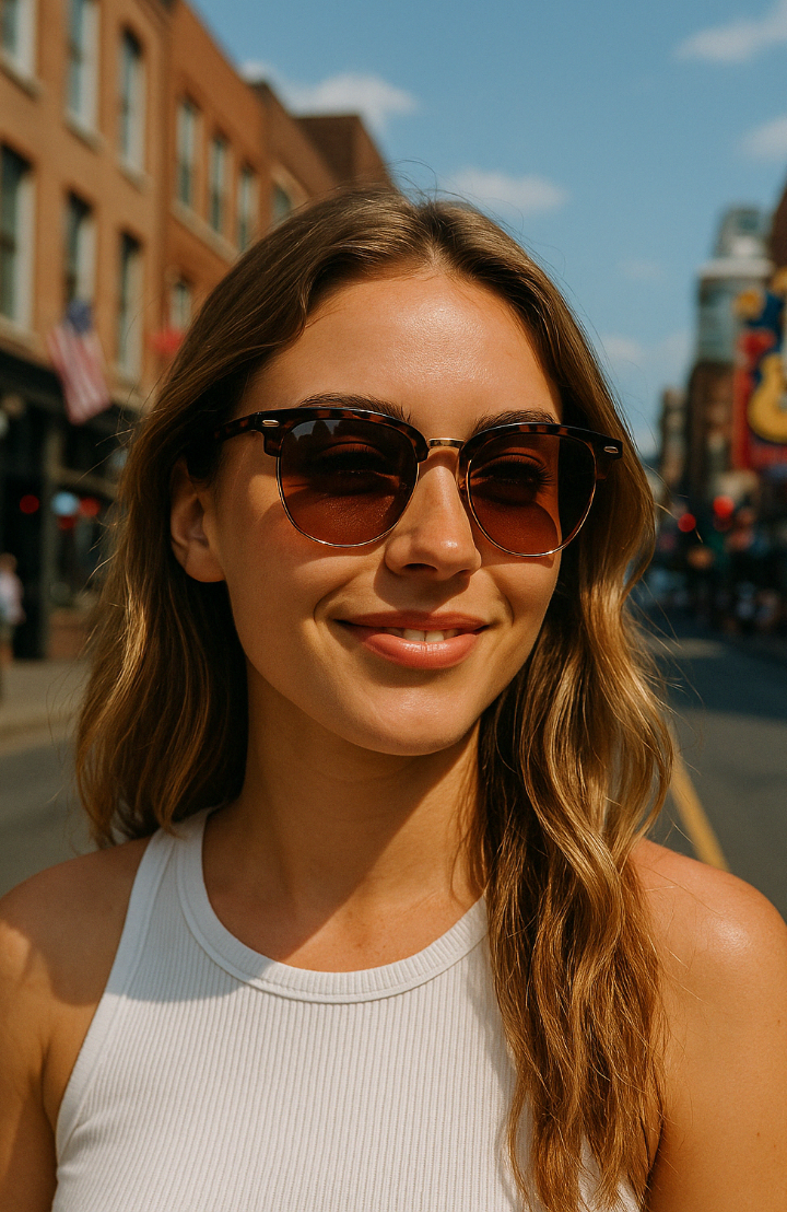 Tortoise + Brown Lens: A warm, rich tortoise shell frame with soft brown gradient lenses for a vintage vibe.