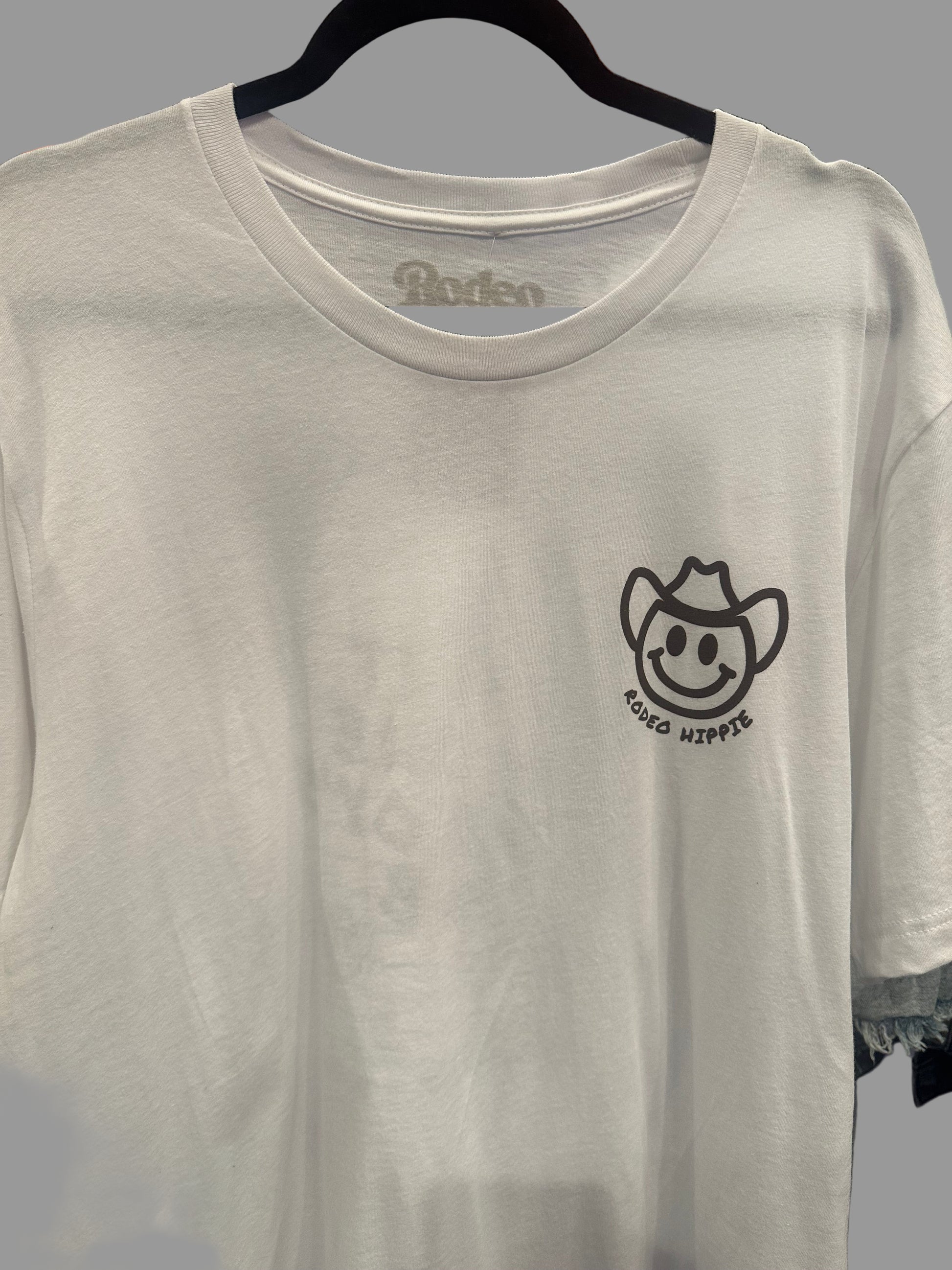 Front: minimalist Rodeo Hippie cowboy smiley logo